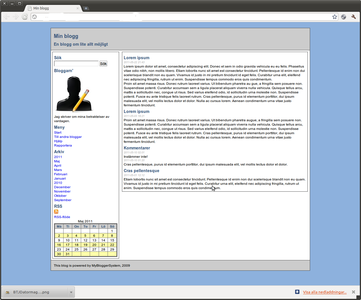 Din uppgift är att göra ett CSS-dokument med namnet ”style.css”. Denna CSS ska användas för att definiera hur bloggsidan skall formateras. Du ska inte ändra något i blogg.html, detta dokument är att betrakta som givet. Du