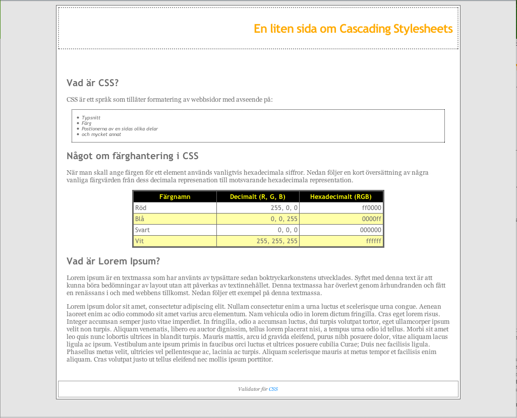 <!DOCTYPE html PUBLIC "-//W3C//DTD XHTML 1.0 Strict//EN" "http://www.w3.org/TR/xhtml1/DTD/xhtml1-strict.dtd"> <html xmlns="http://www.w3.org/1999/xhtml"> <head> <meta http-equiv="Content-Type" content="text/html;charset=utf-8"/> <title>CSS uppgift</title> <link rel="stylesheet" type="text/css" href="style.css"/> </head> <body> <div id ="container"> <div id = "header"> <h1>En liten sida om Cascading Stylesheets</h1> </div> <div id ="content"> <h2>Vad är CSS?</h2> <p>CSS är ett språk som tillåter formatering av webbsidor med avseende på:</p> <ul> <li>Typsnitt</li> <li>Färg</li> <li>Positionerna av en sidas olika delar</li> <li>och mycket annat</li> </ul> <h2>Något om färghantering i CSS</h2> <p>När man skall ange färgen för ett element används vanligtvis hexadecimala siffror. Nedan följer en kort översättning av några vanliga färgvärden från dess decimala representation till motsvarande hexadecimala representation.</p> <table> <thead> <tr> <td>Färgnamn</td><td>Decimalt (R, G, B)</td><td>Hexadecimalt (RGB)</td> </tr> </thead> <tbody> <tr> <td>Röd</td> <td class="number">255, 0, 0</td> <td class="number">ff0000</td> </tr> <tr class ="even_row"> <td>Blå</td> <td class="number">0, 0, 255</td> <td class="number">0000ff</td> </tr> <tr> <td>Svart</td> <td class="number">0, 0, 0</td> <td class="number">000000</td> </tr> <tr class ="even_row"> <td>Vit</td> <td class="number">255, 255, 255</td> <td class="number">ffffff</td> </tr> </tbody> </table> <h2>Vad är Lorem Ipsum?</h2> <p>Lorem ipsum är en textmassa som har använts av typsättare sedan boktryckarkonstens utvecklades. Syftet med denna text är att kunna böra bedömningar av layout utan att påverkas av textinnehållet. Denna textmassa har överlevt genom århundranden och fått en renässans i och med webbens tillkomst. Nedan följer ett exempel på denna textmassa. </p> <p>Lorem ipsum dolor sit amet, consectetur adipiscing elit. Nullam consectetur enim a urna luctus et scelerisque urna congue. Aenean laoreet enim ac odio commodo sit amet varius arcu elementum. Nam vehicula odio in lorem dictum fringilla. Cras eget lorem risus. Integer accumsan semper justo vitae imperdiet. In fringilla, odio a accumsan luctus, dui turpis volutpat tortor, eget ullamcorper ipsum velit non turpis. Aliquam venenatis, libero eu auctor dignissim, tellus lorem placerat nisi, a tempus urna odio id tellus. Morbi sit amet leo quis nunc lobortis ultrices in blandit turpis. Mauris mattis, arcu id gravida eleifend, purus nibh posuere dolor, vitae aliquam lacus ligula ac ipsum. Vestibulum ante ipsum primis in faucibus orci luctus et ultrices posuere cubilia Curae; Duis nec facilisis ligula. Phasellus metus velit, ultricies vel pellentesque ac, lacinia ac turpis. Aliquam scelerisque mauris at metus tempor et facilisis enim aliquam. Cras volutpat justo ut tellus eleifend nec mollis ipsum porttitor.</p> </div> <div id ="footer"> <p>Validator för <a href ="http://jigsaw.w3.org/css-validator/">CSS</a></p> </div> </div> </body> </html>