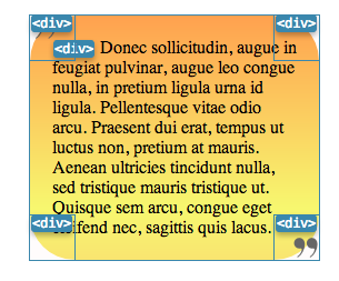 <div class="box"> <div class="tl"></div> <div class="tr"></div> <div class="bl"></div> <div class="br"></div> Lorem ipsum dolor sit amet, consectetur adipiscing elit. Nunc rhoncus vestibulum neque, id elementum libero porta eu. </div> <div class="box"> <div class="tl"></div> <div class="tr"></div> <div class="bl"></div> <div class="br"></div> Donec sollicitudin, augue in feugiat pulvinar, augue leo congue nulla, in pretium ligula urna id ligula. Pellentesque vitae odio arcu. Praesent dui erat, tempus ut luctus non, pretium at mauris. Aenean ultricies tincidunt nulla, sed tristique mauris tristique ut. Quisque sem arcu, congue eget eleifend nec, sagittis quis lacus. </div> <div class="box"> <div class="tl"></div> <div class="tr"></div> <div class="bl"></div> <div class="br"></div> Vestibulum magna purus, interdum eget iaculis quis, posuere nec justo. Sed sed pharetra elit. Aenean egestas leo est, a accumsan erat. Etiam vel odio et ante suscipit rutrum. Ut sed pulvinar nulla. Nulla lectus libero, consectetur in scelerisque nec, pretium scelerisque dui. </div>
